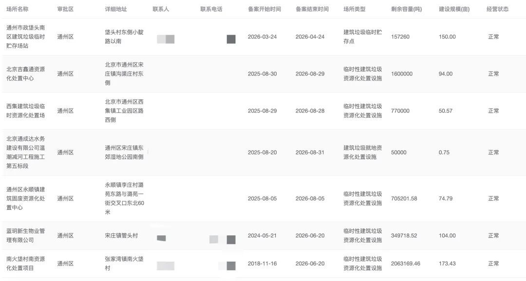 记者通过“北京市建筑垃圾管理与服务平台”查询“建筑垃圾消纳场及临时处置点”信息发现,通州区共有七处公开显示的场所。除通州市政垡头场站为“建筑垃圾临时贮存点”外,其余六处公示场所均为“临时性建筑垃圾资源化处置设施或建筑垃圾就地资源化处置设施”。