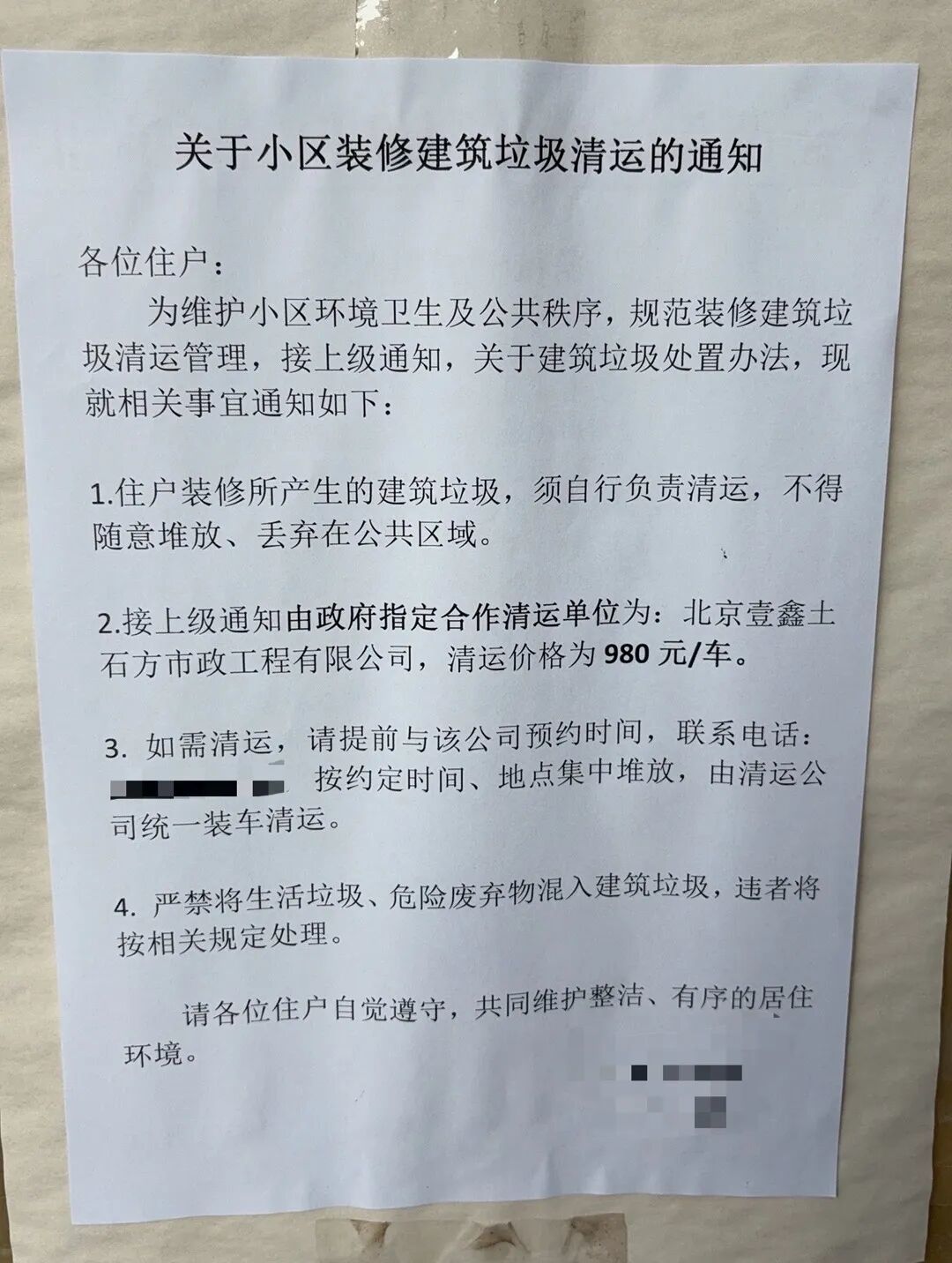 在玉桥街道地界内的某小区楼栋门口,“问北京”记者看到,张贴有一张“关于小区装修建筑垃圾清运的通知”,其中标明:为维护小区环境卫生以及公共秩序,规范装修垃圾清运管理,接上级通知,政府指定合作清运单位为“北京壹鑫土石方市政工程有限公司”,清运价格为980元/车。