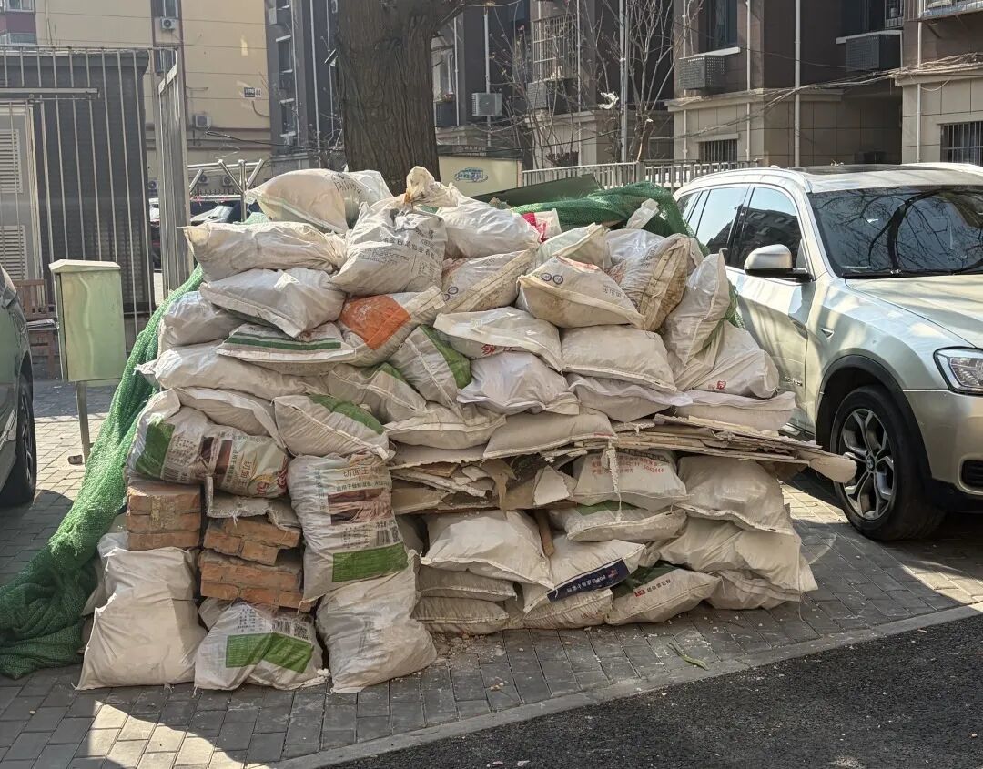 十天过去了,3月31日,“问北京”记者来到李先生所在的小区看到,两百多袋的装修垃圾被绿色苫布盖住,依然堆积在车位上。小区道路本就狭窄,来往的车辆经过时需要缓慢让行。李先生告诉记者,从今年起,通州区各小区的装修垃圾清运消纳,统一交由一家名为“通城建”的公司负责。垃圾运下楼至今,承诺及时清运的车辆却始终没有露面。其间,对方给出的理由也反复变化。“说在检查拉不了,又说这两天车不够使了,但这东西不能天天在那儿堆着啊。”李先生说。
